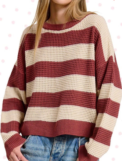 Stylish pullover in a super soft fabric that you would love to be in all day, Featured in a striped knit fabrication with long sleeve, round neckline and a loose fit. Match with any bottoms such as jeans, skirts, or bike shorts to give a varsity look.