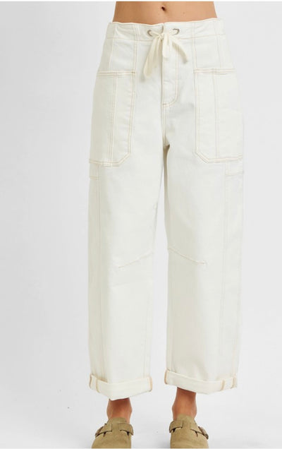 Elevate your style with these high-rise, cropped wide-leg pants featuring a unique barrel fit. In a creamy shade accented by tan stitching, they come with handy cargo pockets for a cool, casual vibe. With a 12" rise and inseam measuring 25" after cuff (27.5" before cuff) in size 3/26, these pants blend comfort and flair. Crafted from a soft mix of 68% cotton, 30% polyester, and 2% spandex, they’re perfect for playful, everyday wear.