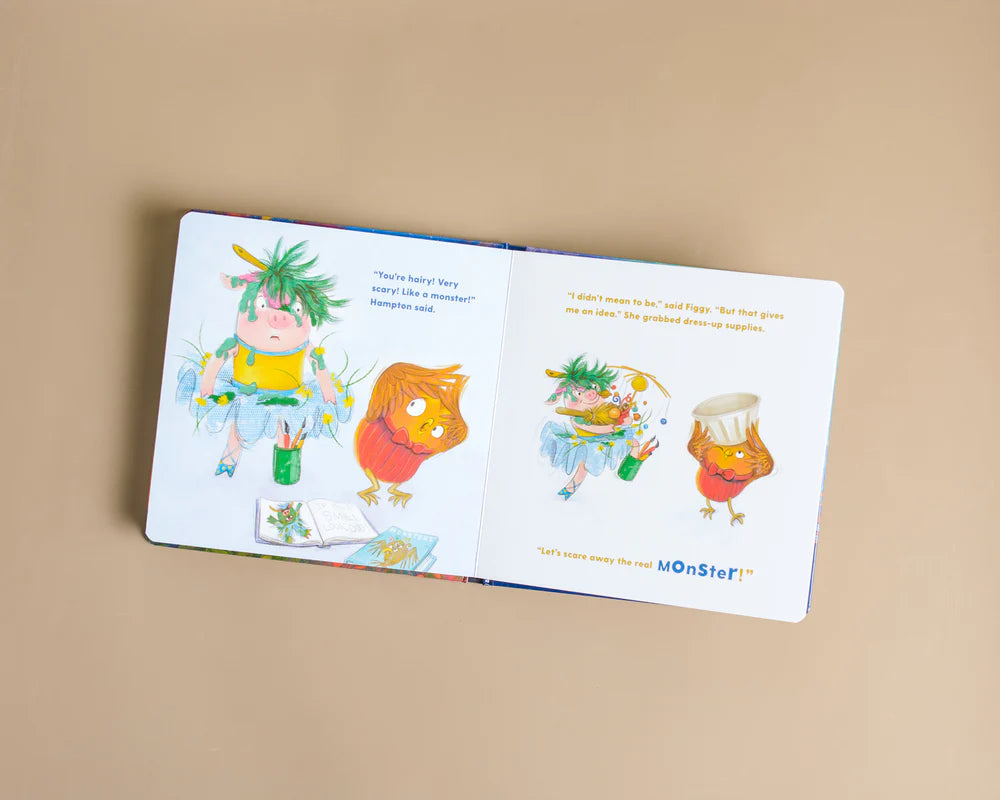- tells the funny story of Hampton the owl and Figgy the pig as they work together to fend off a scary-sounding monster that turns out to be someone friendly and ready to play;