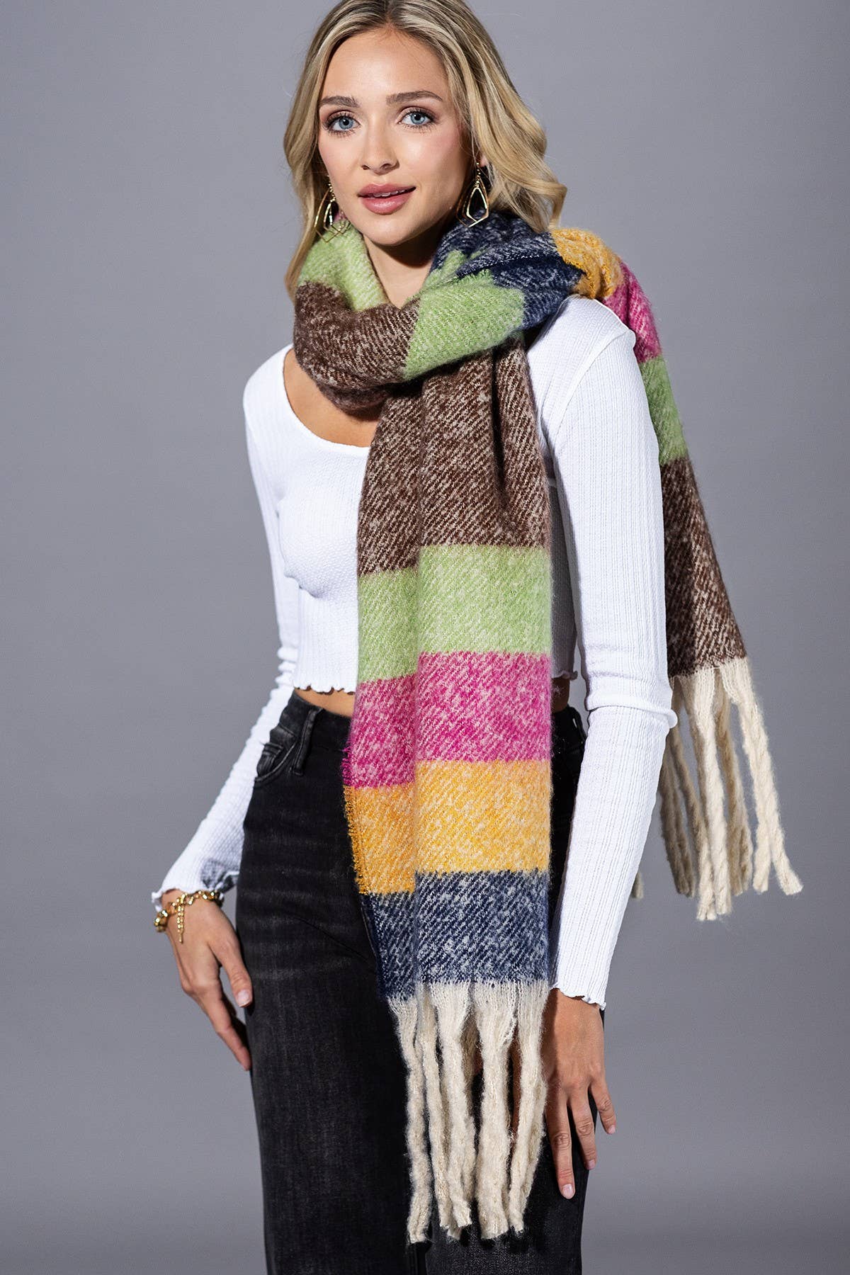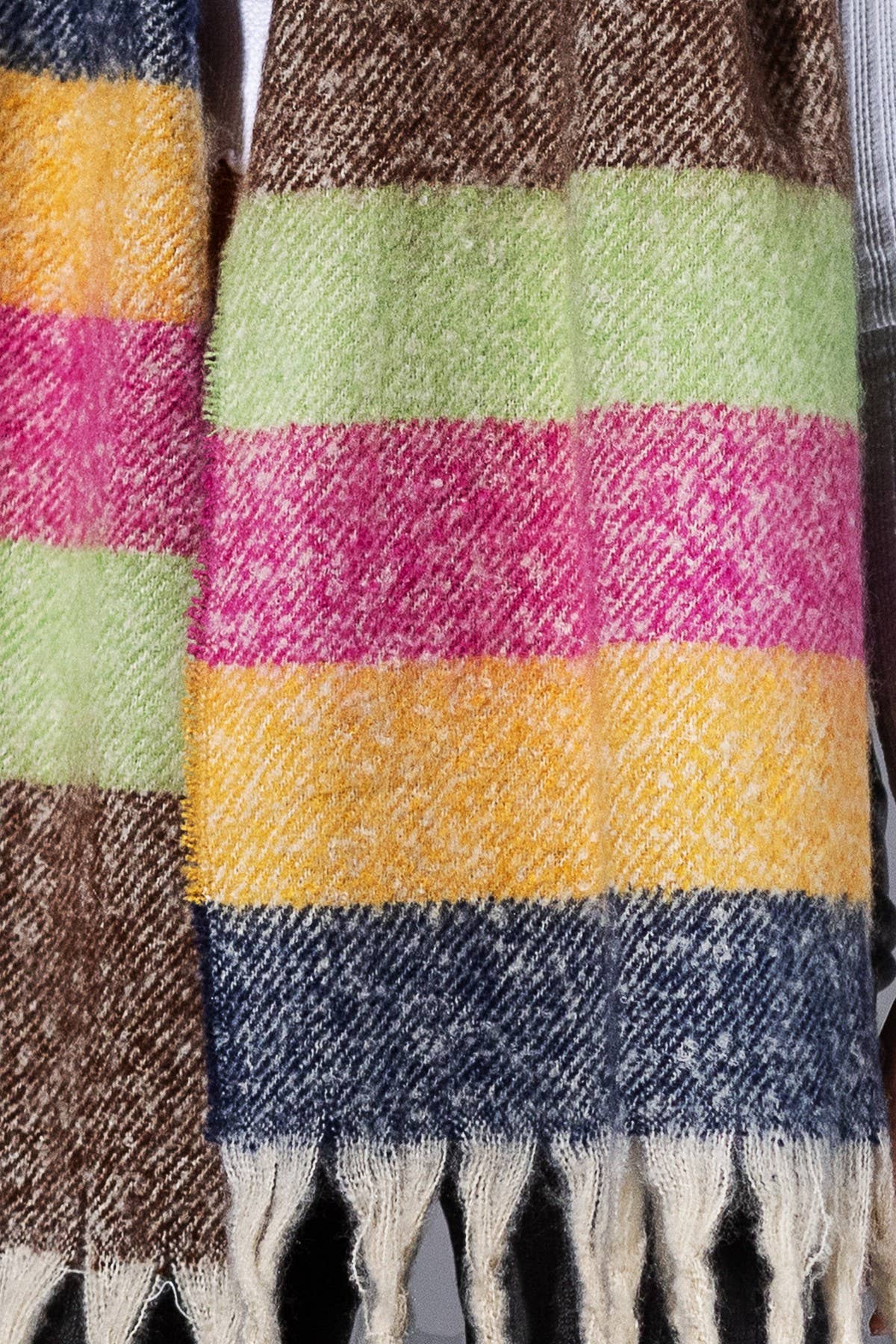 Brighten up chilly days with this playful multi-color striped scarf. Crafted in a brushed, super-soft fabric, it features bold color blocking and long fringe edges for a cozy yet stylish finish. Its oversized design makes it perfect for wrapping, layering, or draping as a statement accessory. *100% Polyester *APPROX. L 71" W 16" 10.34oz *Imported