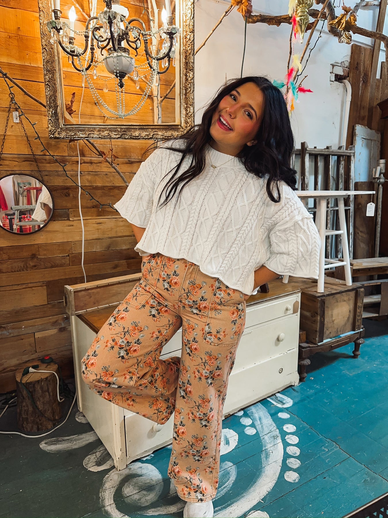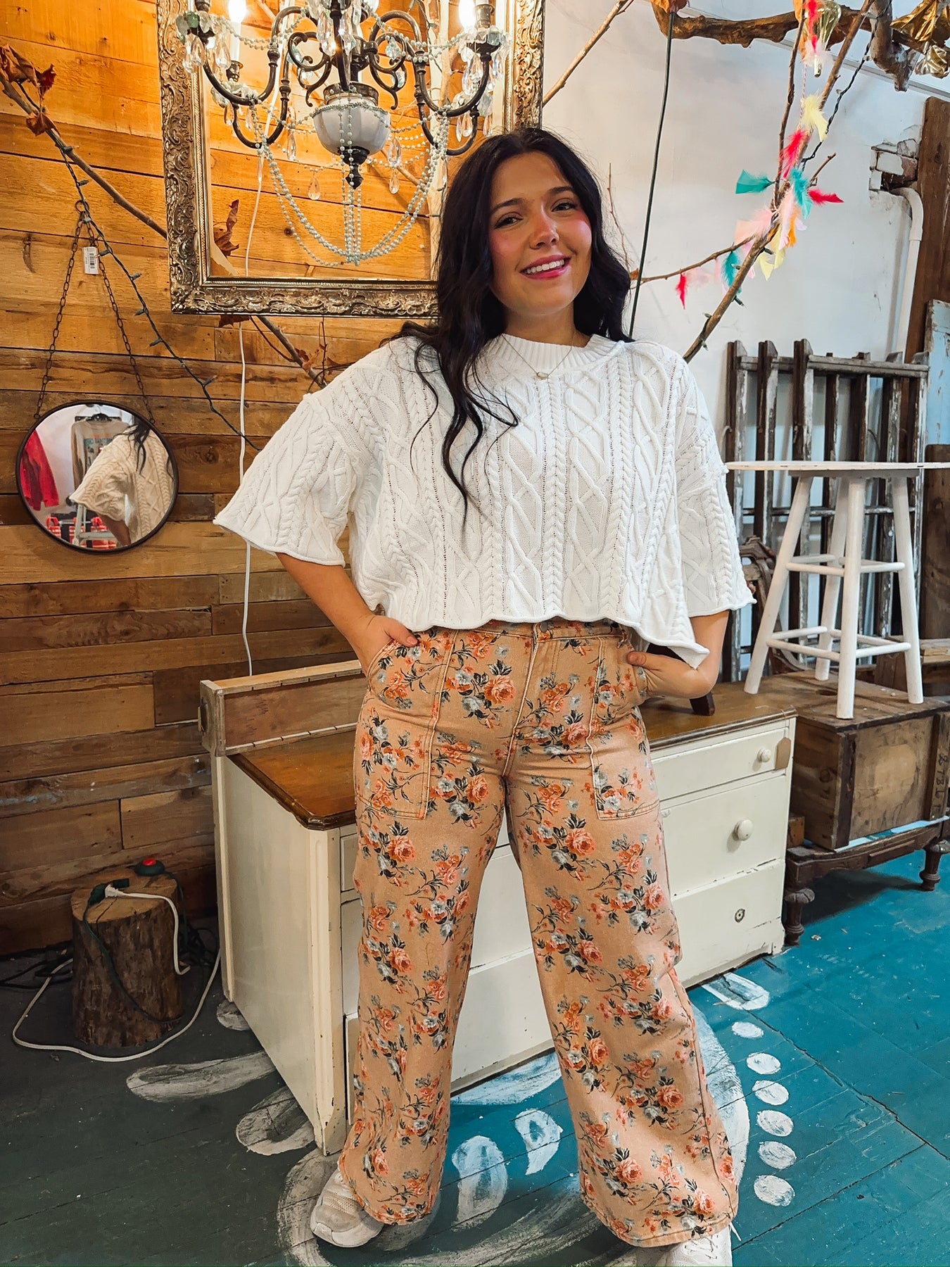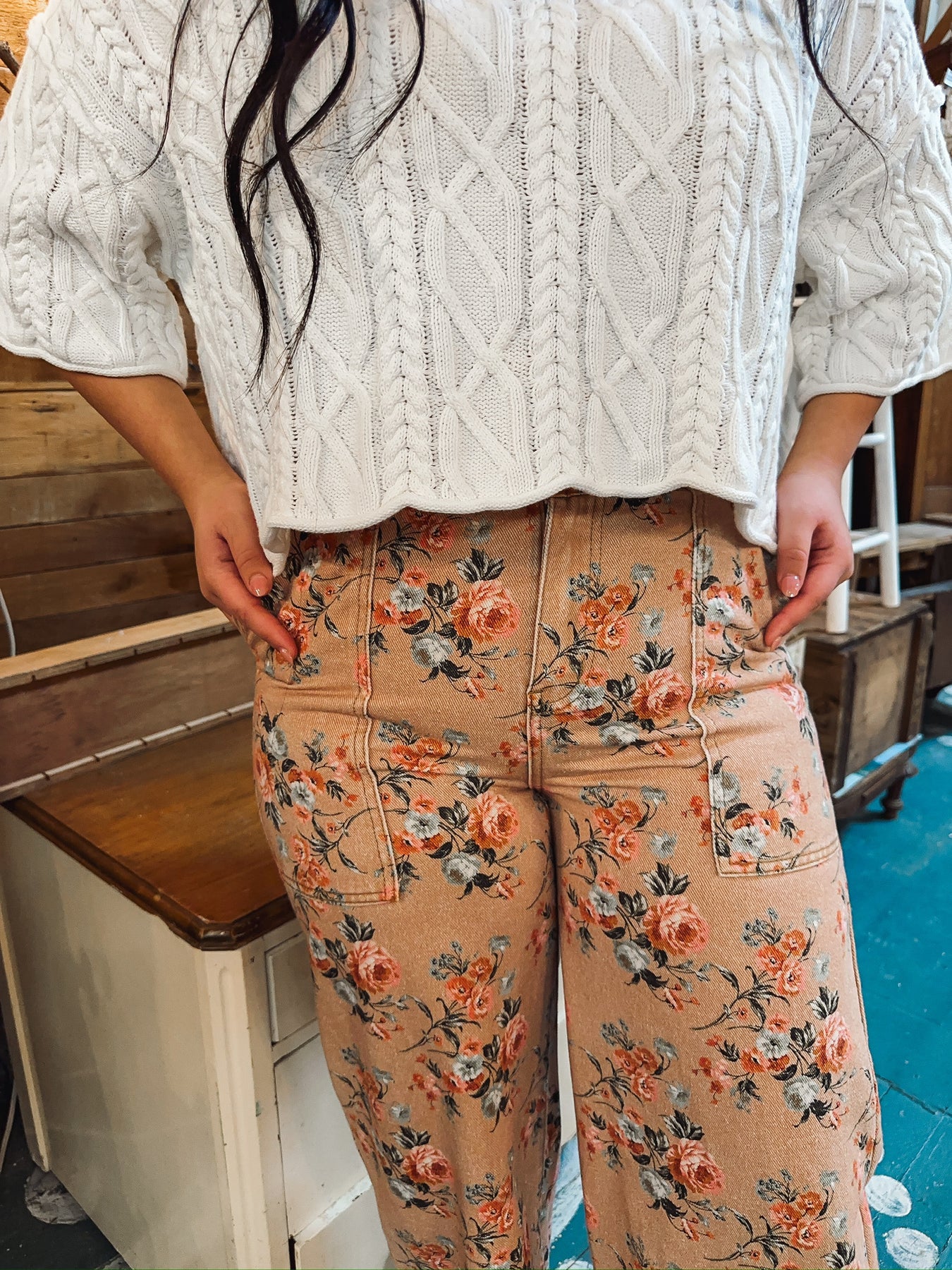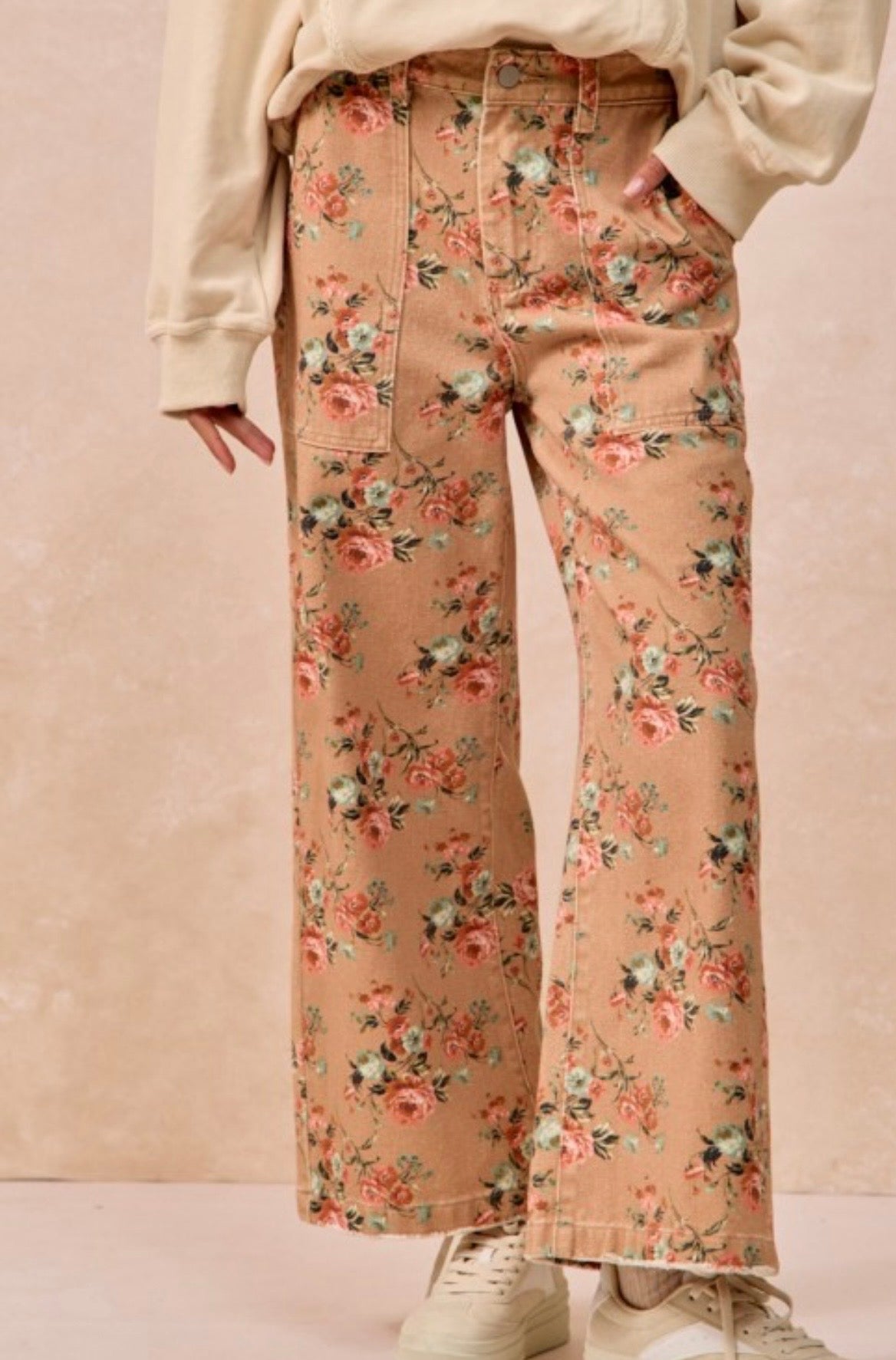 Step into comfort with these charming wide-leg jeans featuring a delicate flower print that brings vintage flair to your everyday look. The soft washed finish gives them that perfectly lived-in feel, while flat front pockets keep things streamlined and chic. Crafted without stretch for a structured silhouette, these ginger-toned beauties are your new go-to for effortless style. 100% Cotton.