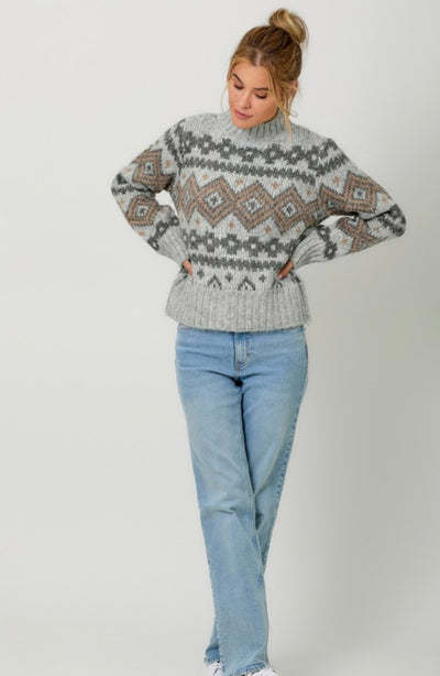 Stay cozy and stylish in this Fair Isle Mock Neck Sweater. Featuring a loose fit, ribbed details on the mock neck, cuffs, and hem, and a blend of acrylic, polyester, nylon, and wool, this sweater is perfect for beating the chill. The grey mix with gold lurex adds a touch of glamour to the classic design. Don't let the cold weather stop you from looking fabulous!