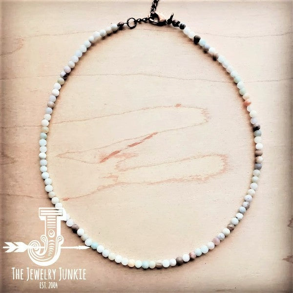 Beaded Necklace is made of genuine Frosted Amazonite stones. Collar necklace is meant to be worn at the collar bone. Great for layering or as a statmetn piece. Entire length of necklace is 15 inches end to end plus a 2\" extender.