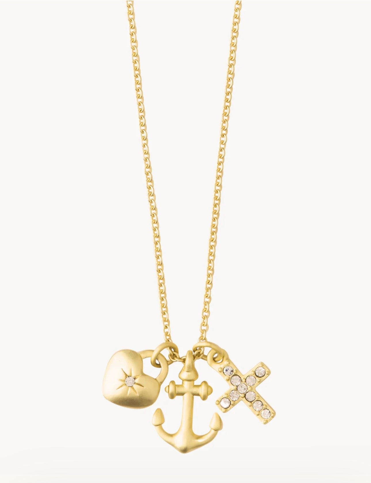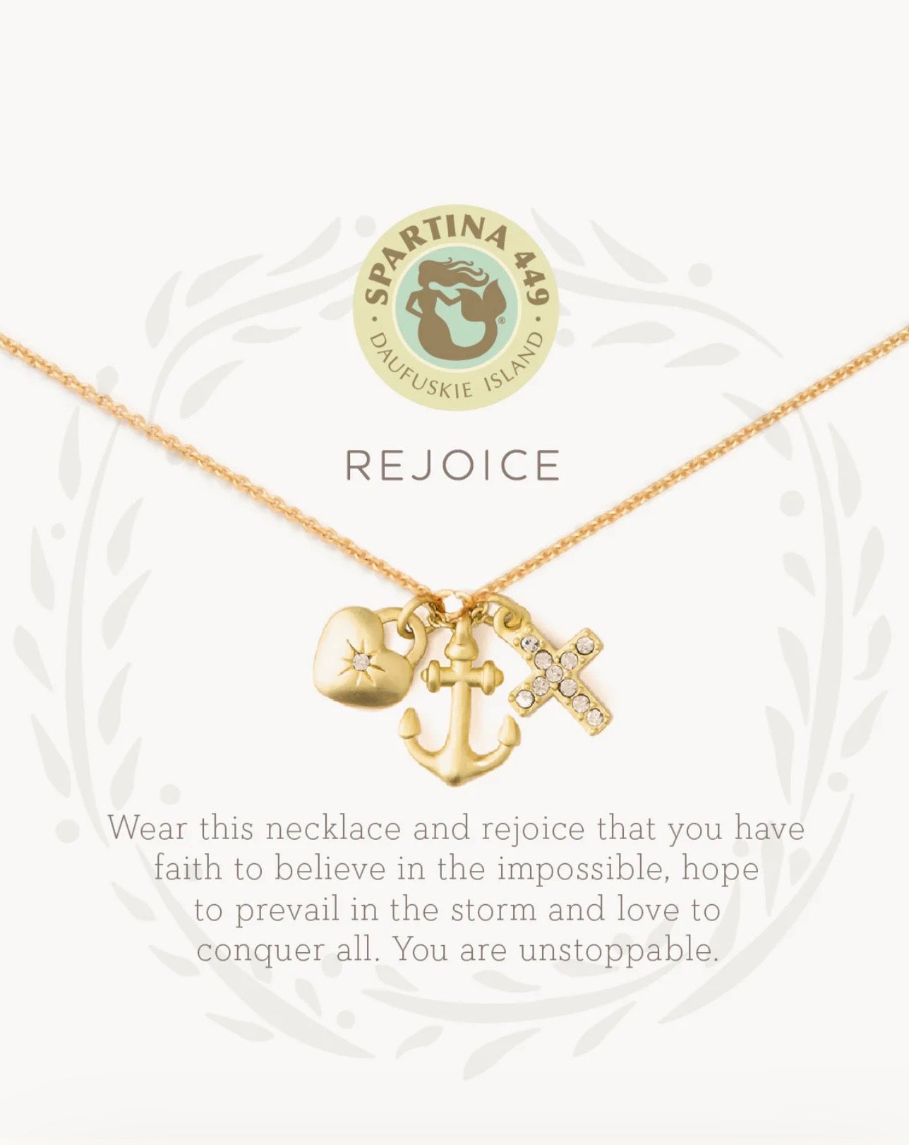 Wear our Rejoice Necklace as a reminder that all things are possible with faith. Featuring a faith, hope, and love charm, this special piece comes packaged inside a beautiful box with the message: "Wear this necklace and rejoice that you have faith to believe in the impossible, hope to prevail in the storm and love to conquer all. You are unstoppable."