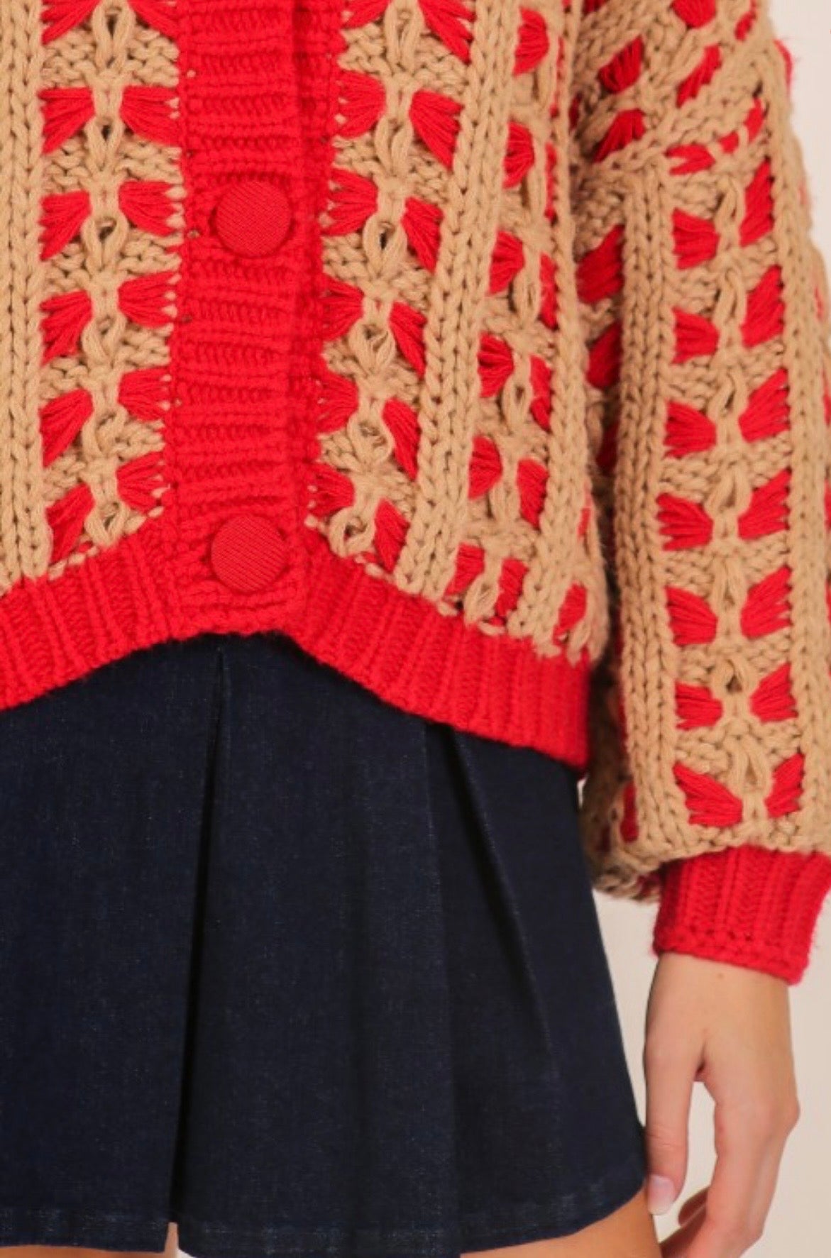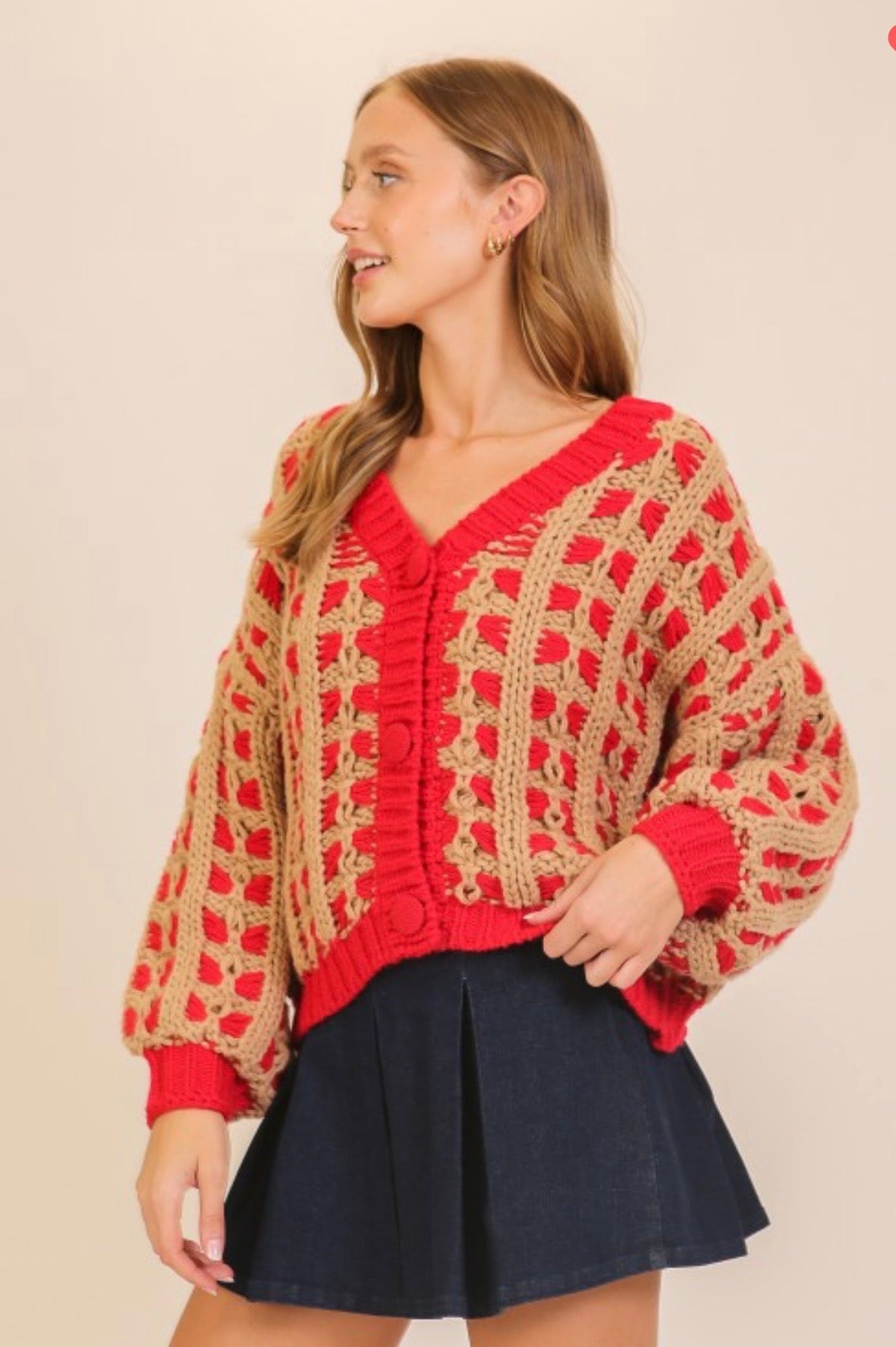 Add texture and personality to your cold weather wardrobe with our Chunky Lattice Button Front Cardigan - a playful yet cozy layering piece in a vibrant cherry red.