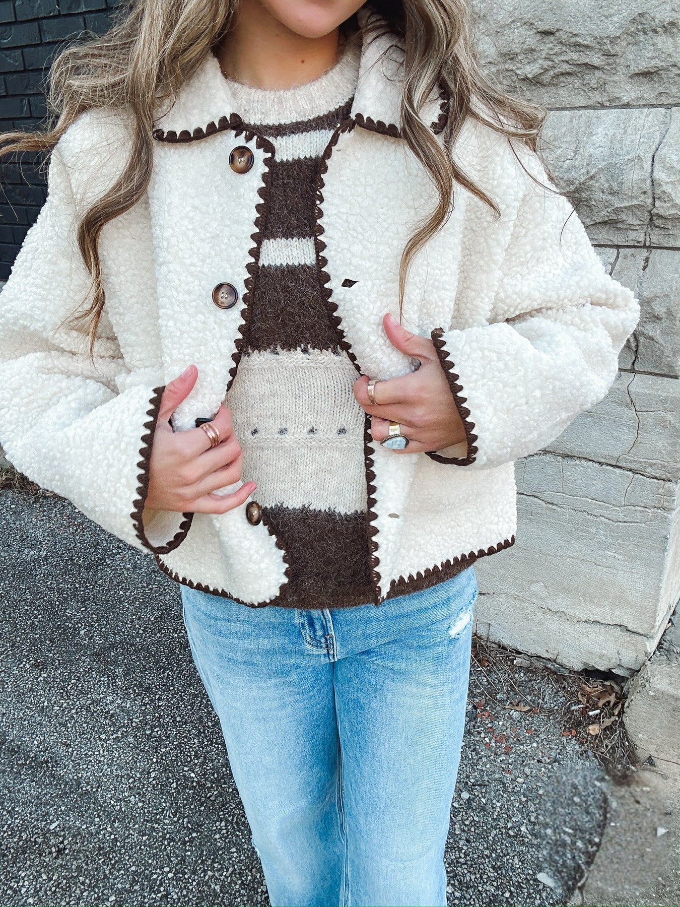 Wrap yourself in cloud-like comfort with this sherpa jacket that's equal parts cozy and chic. The plush polyester exterior gets a modern twist with sleek contrast trim framing the collar, cuffs, and hem—because who says warm has to be boring? A simple button front and relaxed fit make it the perfect throw-on layer for everything from coffee runs to casual hangouts. Lightweight yet incredibly soft, this is your new go-to for effortless style.