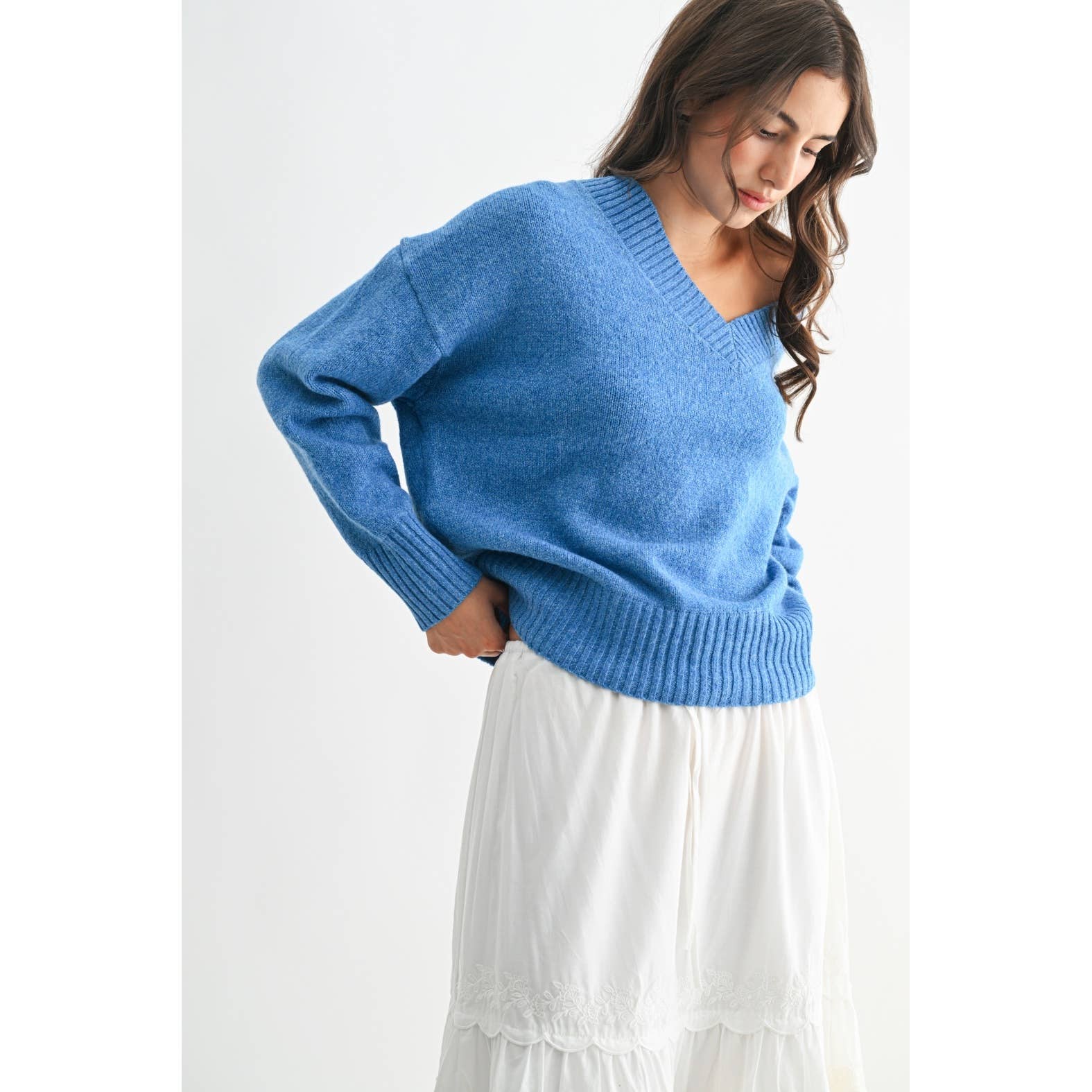 Looking for that go-to sweater you'll want to wear everywhere? Meet your new favorite: this soft, relaxed-fit blue knit sweater. The inviting, vibrant blue color instantly brightens up any day, while the wide V-neckline flatters and layers like a dream. It's all about comfort, but never at the expense of style. SELF: 43% ACRYLIC 30% NLYON 27% POLYESTER Model is wearing a size S Model : 5'9" - B 32" - W 24" - H 36.5"