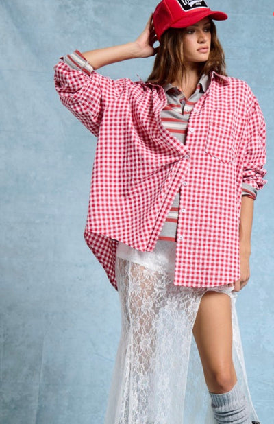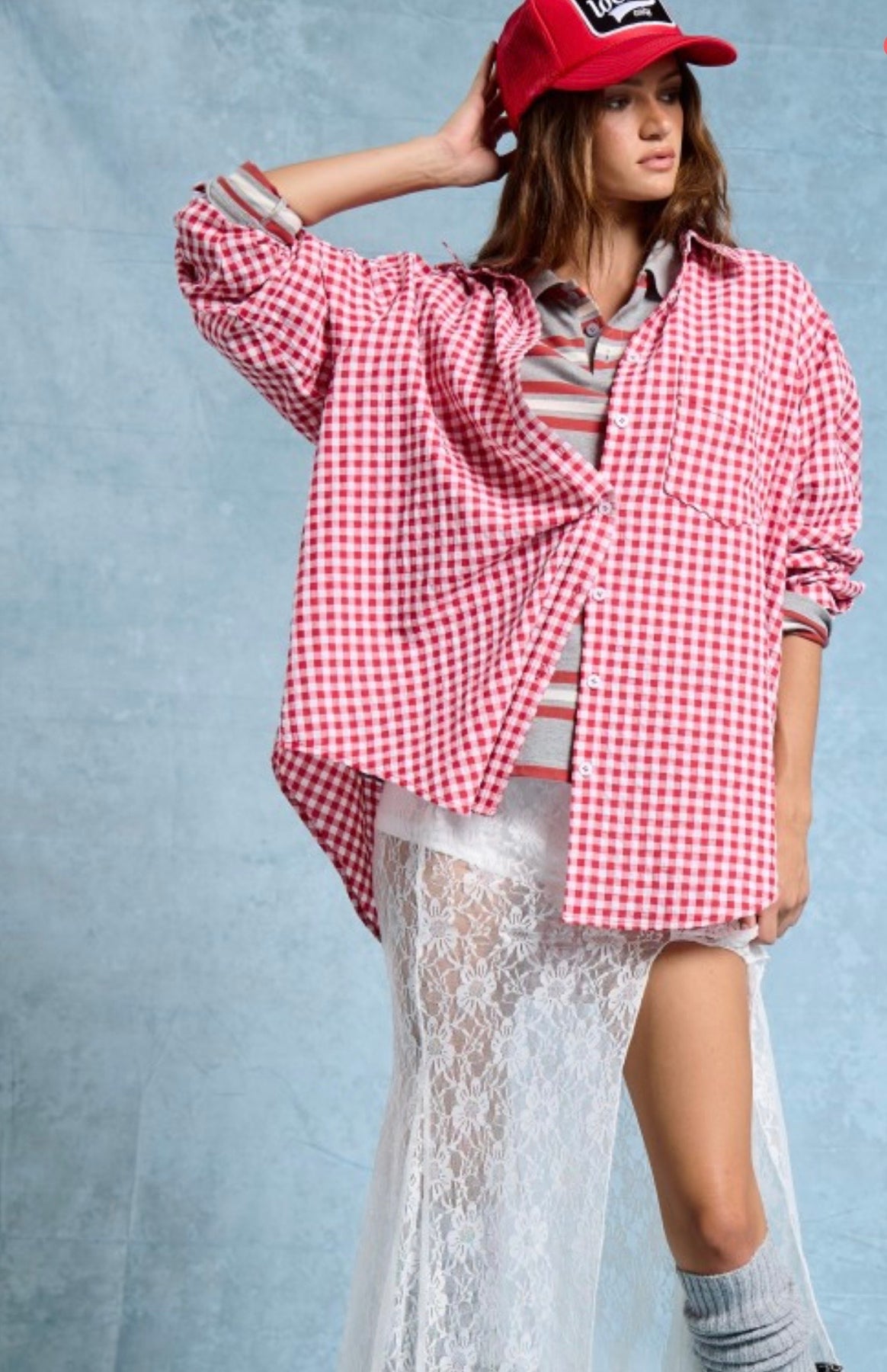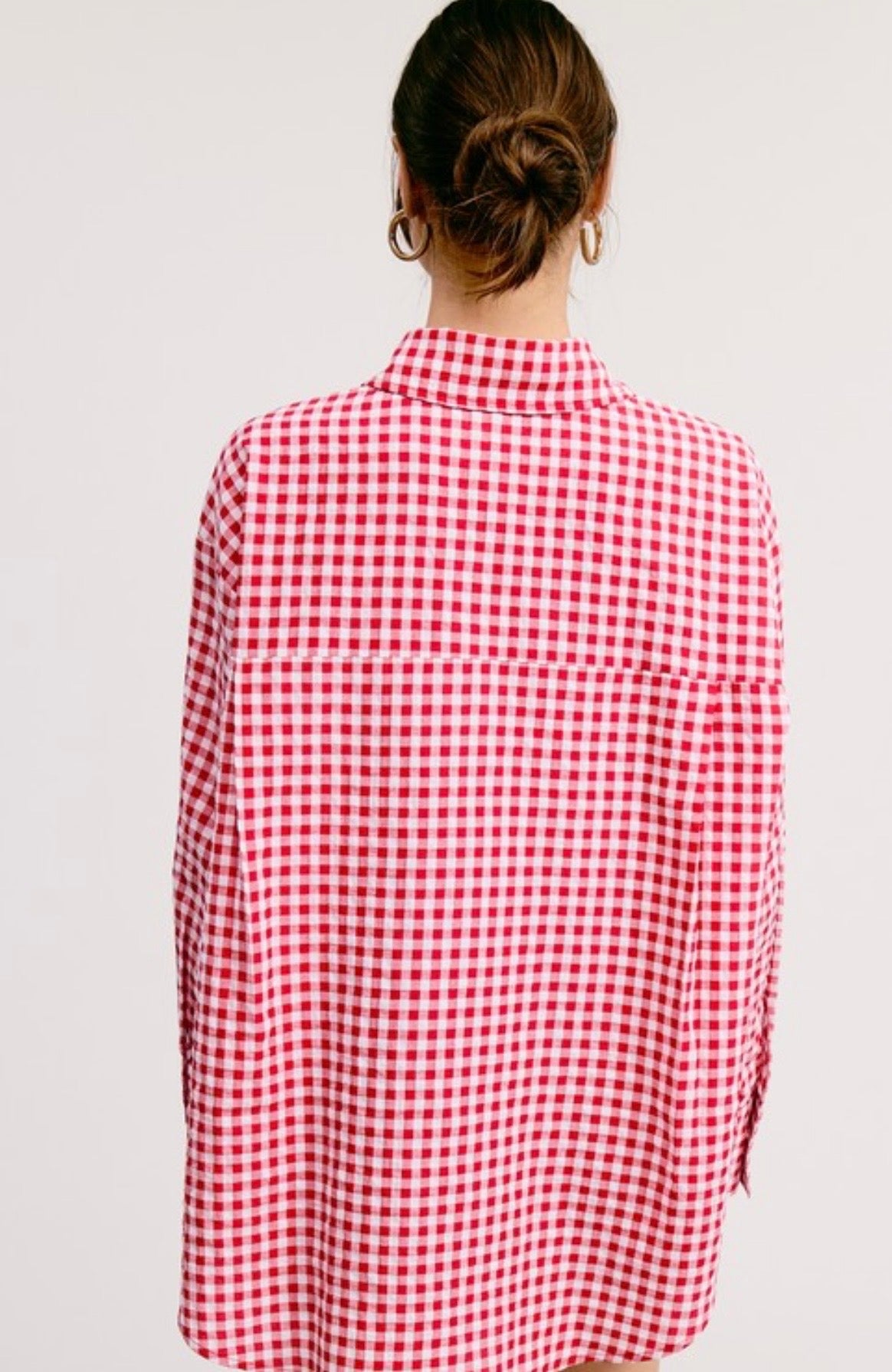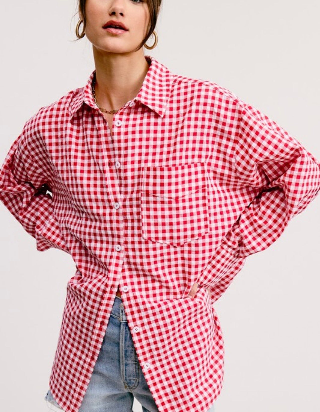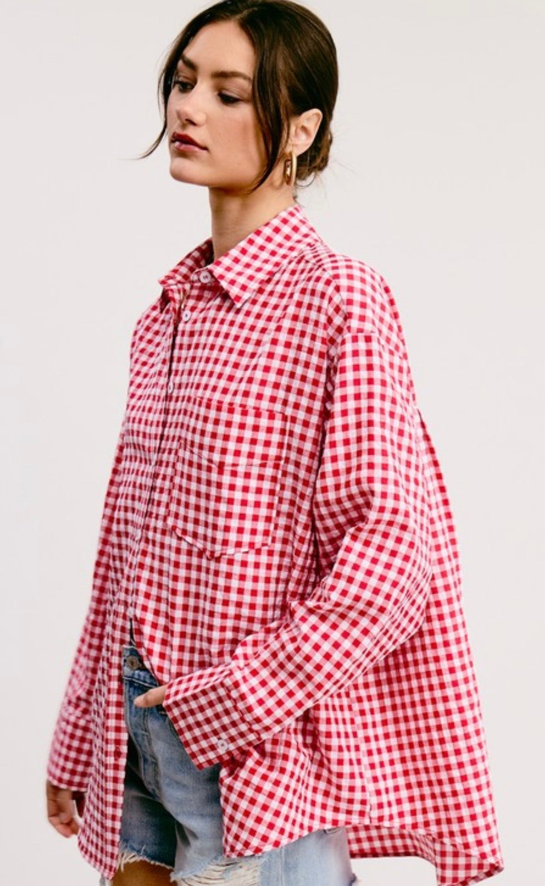Our new collared button-down oversized shirt featuring a gingham print and a single front pocket. This piece can be styled buttoned up, partially unbuttoned or completely unbuttoned as a stylish outerwear piece. Pair this with your favorite denim or skirt to achieve that effortlessly chic look.