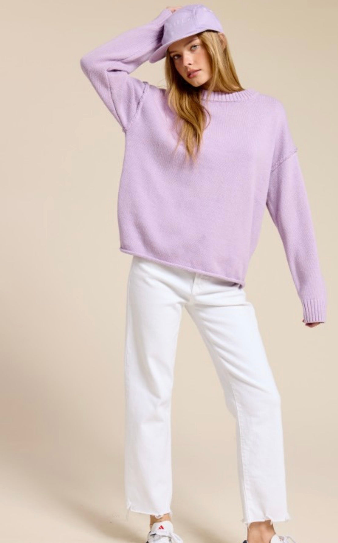 Made from a mid weight knit, this pullover sweater features a ribbed crew neckline, ribbed sleeve cuffs, raw edge hem, and drop shoulders highlighted by exposed outseam detailing for a subtle, modern touch. Finished with an oversized, relaxed silhouette, it’s the perfect everyday layer, cozy enough to wear solo and easy to style through the colder months. 60% Cotton, 40% Acrylic